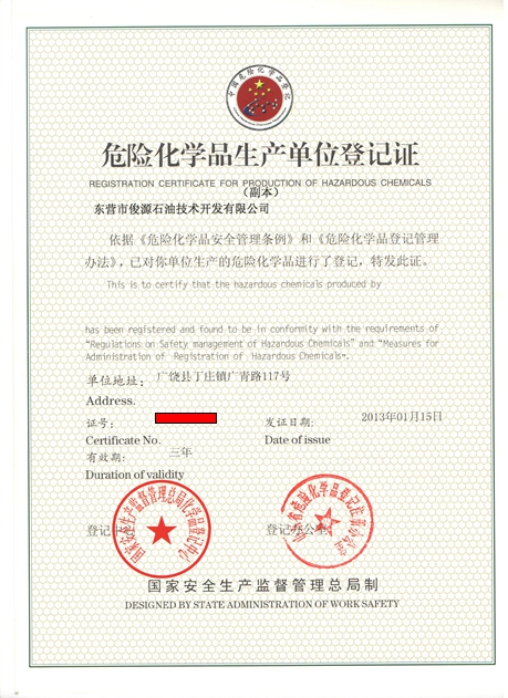 - 國(guó)家高新區(qū)“瞪羚企業(yè)” 高新技術(shù)企業(yè)證書 山東省“一企一技術(shù)”創(chuàng)新企業(yè) 2015年山東省節(jié)能環(huán)保企業(yè)100強(qiáng) 東營(yíng)市科技進(jìn)步獎(jiǎng) 危險(xiǎn)化學(xué)品登記證 危險(xiǎn)化學(xué)品登記證 山東省企業(yè)技術(shù)創(chuàng)新獎(jiǎng) 安全生產(chǎn)許可證 尊師重教先進(jìn)單位 危險(xiǎn)化學(xué)品經(jīng)營(yíng)許可證 食品生產(chǎn)許可證 全國(guó)工業(yè)產(chǎn)品生產(chǎn)許可證 道路運(yùn)輸經(jīng)營(yíng)許可證